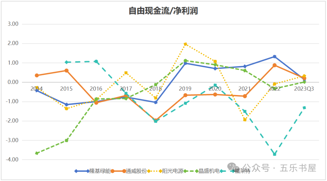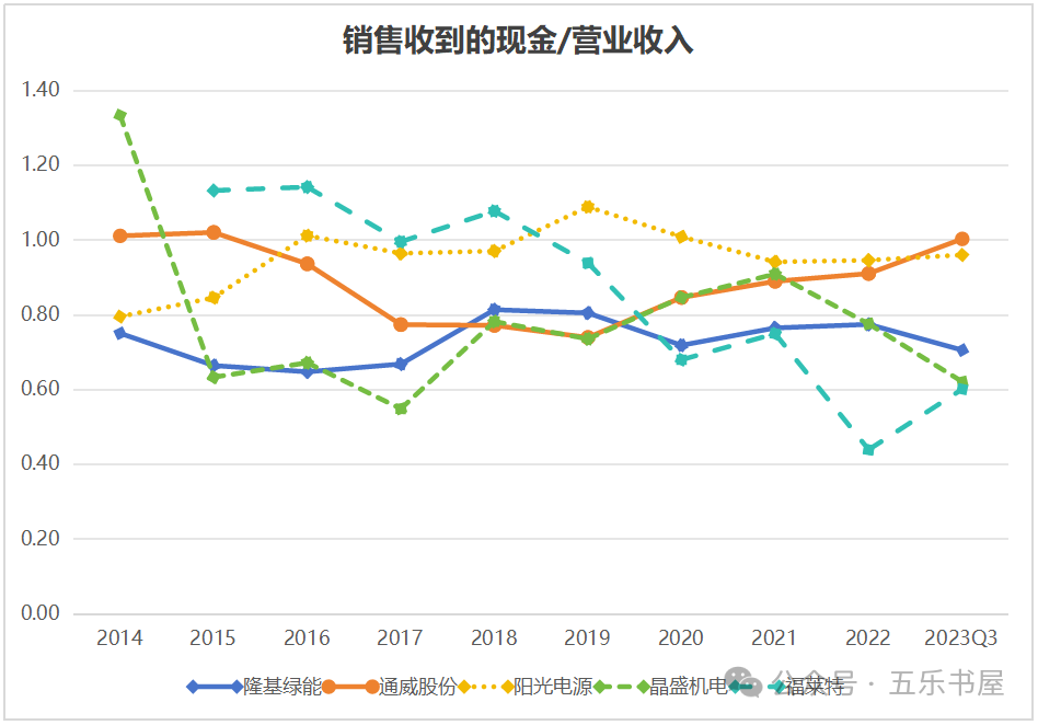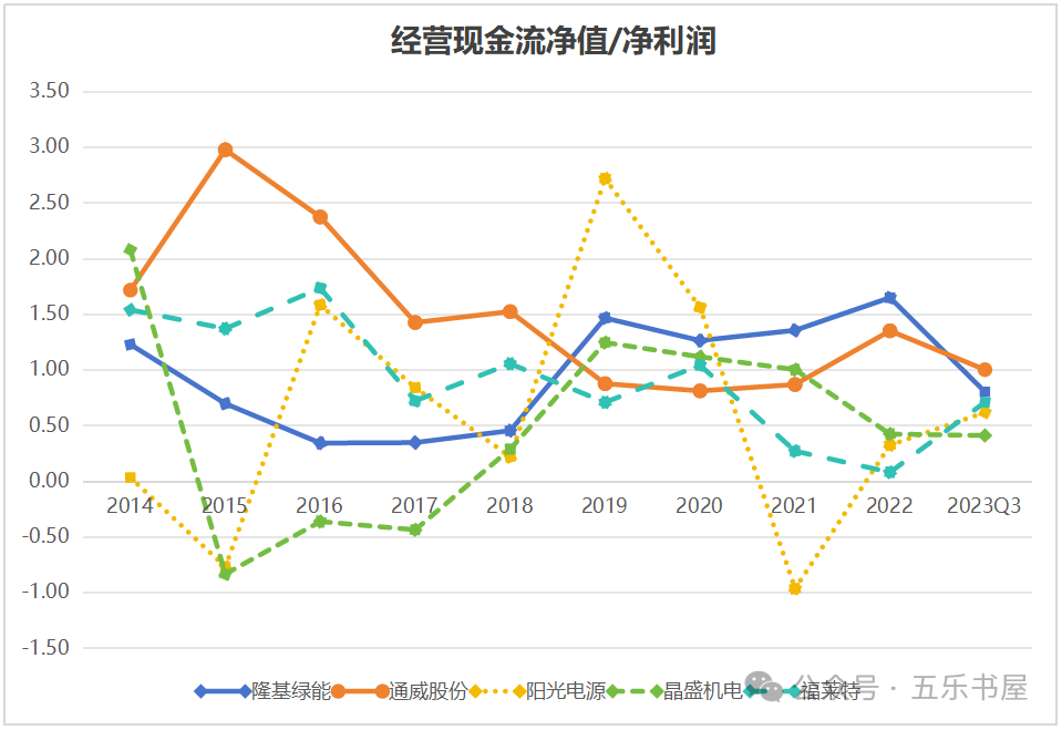 从上图中我们可以看到,这5个公司的均值都小于1,这说明整个行业的收款方式就不完全是现金,产业链存在链条式的应收账款,会相应增加所有环节公司经营性资产和负债,相比较而言,阳光电源的比值最高且较为稳定,福莱特向下趋势非常明显,且到了2022和2023年已经变成了最低。