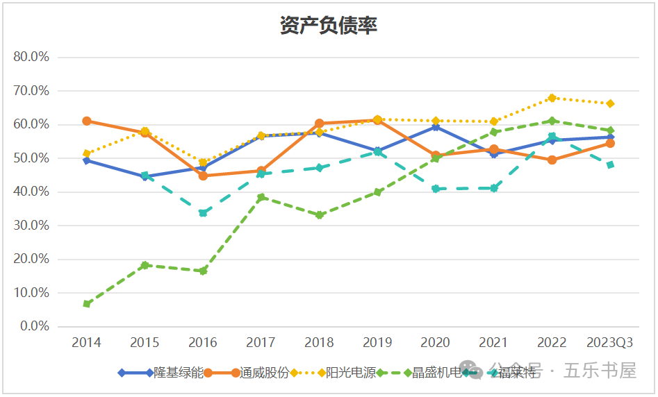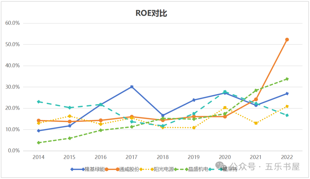 ROE是净资产回报率,反映的是公司的资本运用水平。如上图所示,平均来看,隆基最高,阳光电源最低;从趋势上来看,通威持续向上,特别是2022年有一个巨大的上升,隆基也是波动向上,阳光电源保持平稳,晶盛机电持续上升,并且非常稳定,福莱特相对比较平稳。
