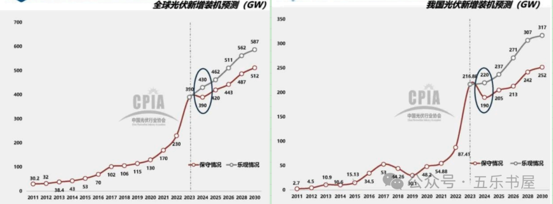 站在现在看未来,即使乐观情况,到2030年,全球装机容量也只能从2023年的390GW增长到587GW,保守情况只有512GW,我们取一个中间数,550GW,那么2023到2030年的7年时间,年化复合增速为5%,虽然还有增长,但增速已经大幅下滑,已经不可能再有过去10年的超高速增长了。