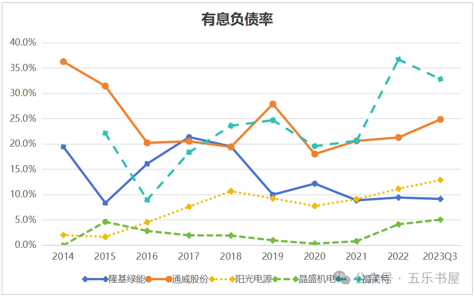 有息负债率反映的是公司的财务压力,表现最好的就是晶盛机电,有息负债极少;其次是阳光电源,虽然有所上升,但整体还是很低;隆基的有息负债率逐渐下降;通威的经营策略相对激进一点,一方面有大量的现金在账上,另一方面有息负债率最高,平均达到了24%,虽然还款压力不大,但会拉低净盈利能力;福莱特的表现最差,最近两年已经变成了最高,且趋势一直向上,有不小的财务负担。