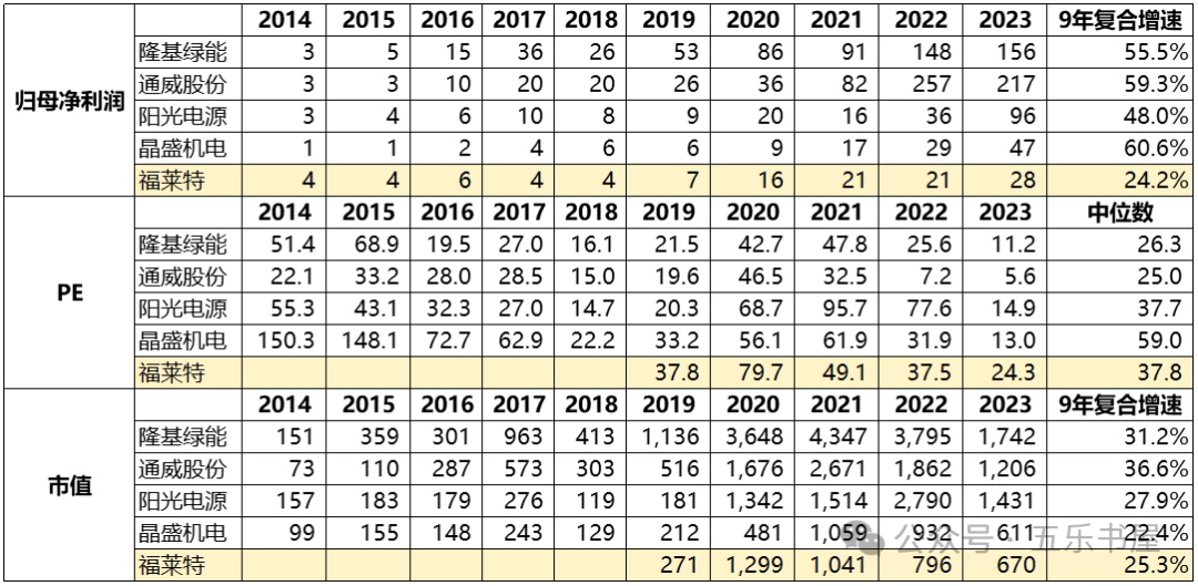 从上图我们可以看出,这5家公司归母净利润在过去9年时间里都大幅提升,最高的是晶盛机电和通威,9年上涨46倍左右,复合增速高达60%;隆基稍微低一点但也差不了太多;阳光电源复合增长48%,最后的2023年增长较大;最差的福莱特,9年时间里也有6倍的涨幅,复合增速达到24%。