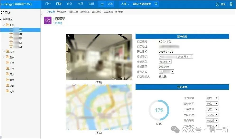 店铺新建流程审批通过之后自动生成门店基础信息卡片。所有计划开店的门店信息可以根据区域维度进行查询。