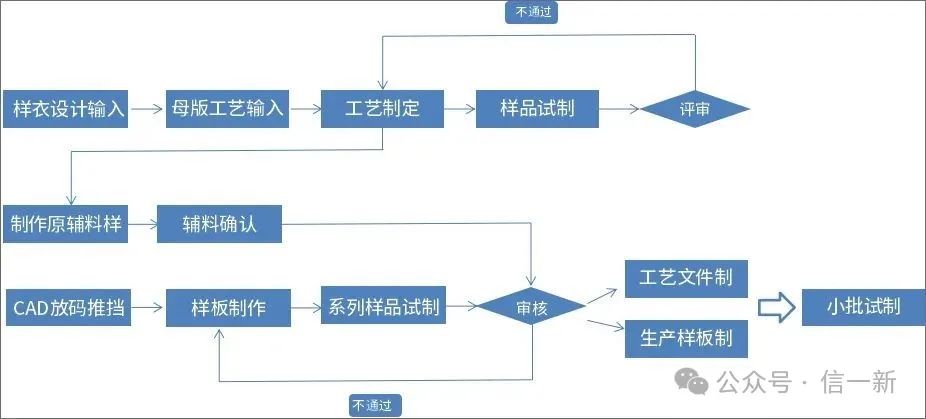样品试制申请流程:为了让业务部门与技术部门快速实现信息、资源共享,可通过流程进行沟通:由业务部门根据市场调研,开具新产品版单,技术部接收,版房执行,并且通过项目管理模块进行任务追踪。