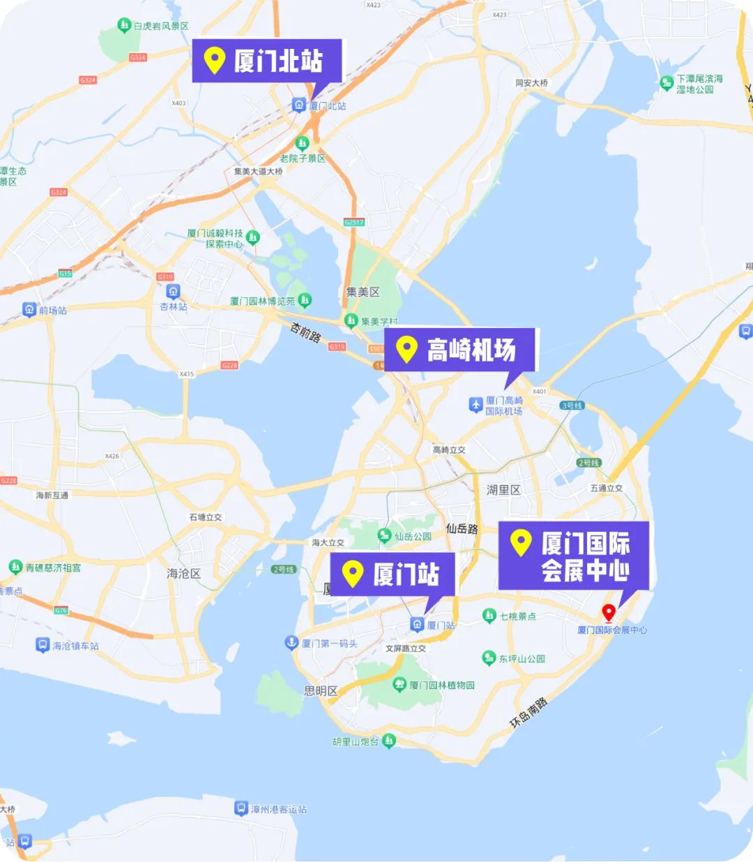 从厦门高崎国际机场出发,乘坐出租车(车程约30分钟)或乘坐空港快线曾厝垵线从T3候机楼空港快线站上车到会展南路口站下车(车程约1小时30分钟)。