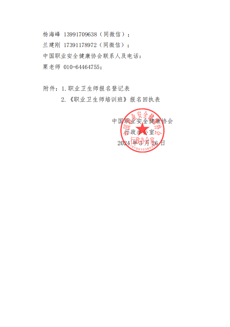 注册职业卫生师线上、线下官方指定报名处联系人:杨主任13991709638(微信同)添加微信获取报名表。