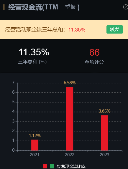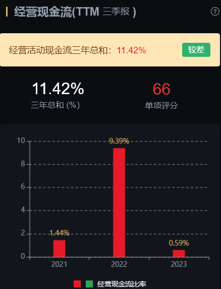 风险角度看,经营活动现金流三年总和 11.42%,表现较差;公司无商誉、无大股东质押、无高管大股东减持。公司风险指标整体良好,瑕疵在于现金流较差。