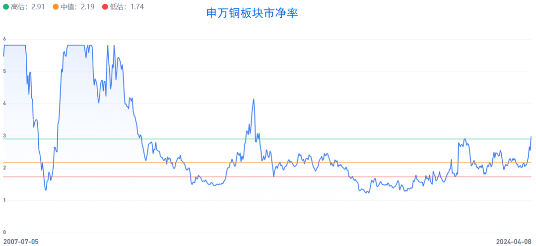 目前,申万铜板块估值为市盈率21.3,估值分位高于上市以来21.47%的时间。市净率为2.99,高于上市以来75.91%的时间。市盈率角度,铜板块估值处于较低的位置,但从市净率看目前估值并不低。