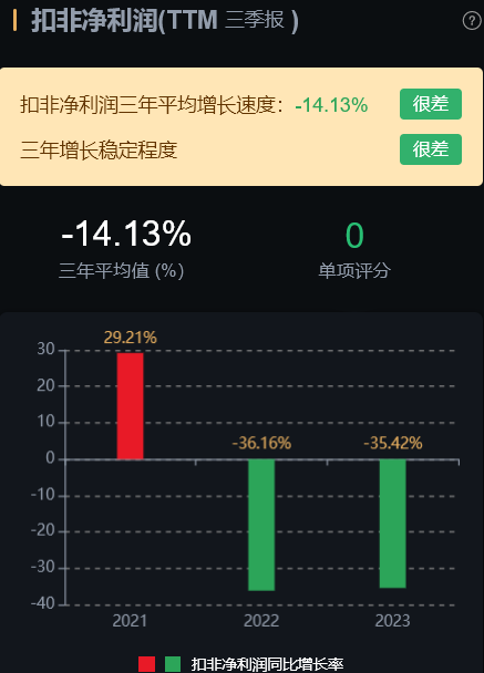 经营层面看,营业收入三年平均增长速度:38.7%;扣非净利润三年平均增长速度:-14.13%