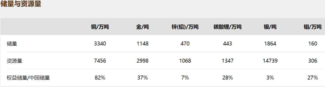 主力矿种铜、金资源量及产能位居中国领先、全球前十,拥有铜资源量约 7500 万吨、黄金约 3000 吨。