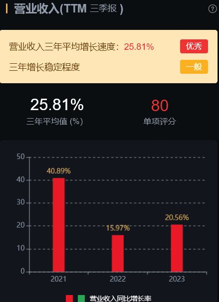经营层面看,营业收入三年平均增长速度:25.8%;扣非净利润三年平均增长速度:40.2%