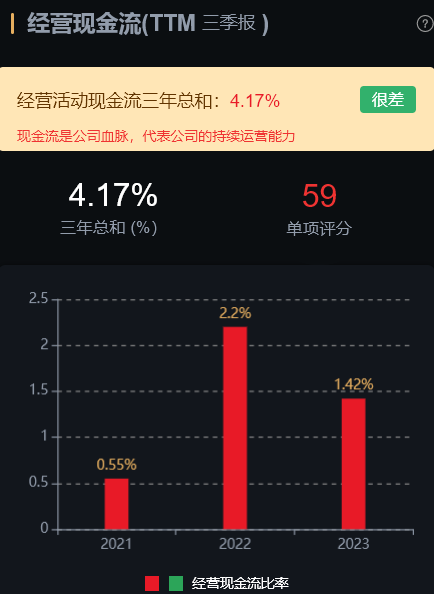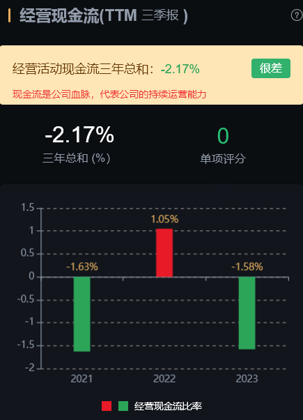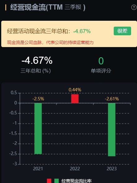 风险角度看,经营活动现金流三年总和 -2.17%,数据很差;公司无商誉、无大股东质押、无高管大股东减持。现金流是公司血脉,数据很差代表公司的持续运营能力很差。