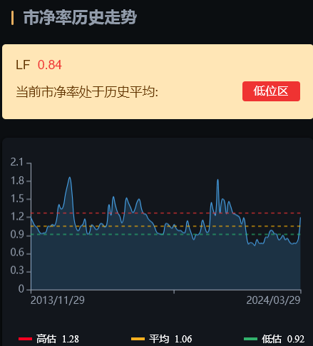 最后看估值情况,滚动市盈率10.93倍,市净率0.84倍,当前市盈率(TTM)、市净率(LF)均处于历史平均:低位区。