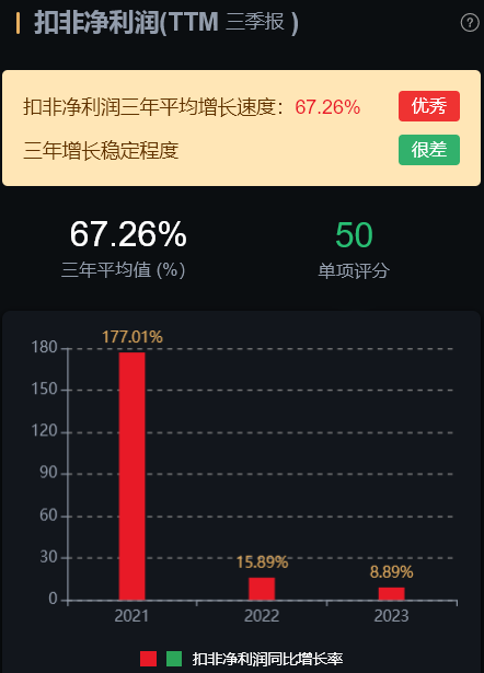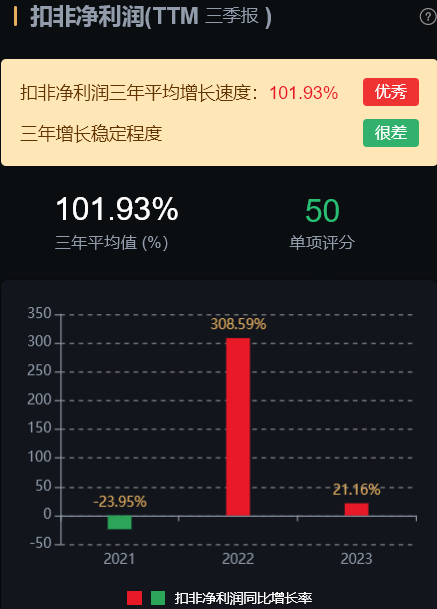 经营层面看,营业收入三年平均增长速度:20.78%;扣非净利润三年平均增长速度:101.9%