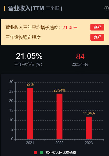 经营层面看,营业收入三年平均增长速度:21.05%;扣非净利润三年平均增长速度:54.9%