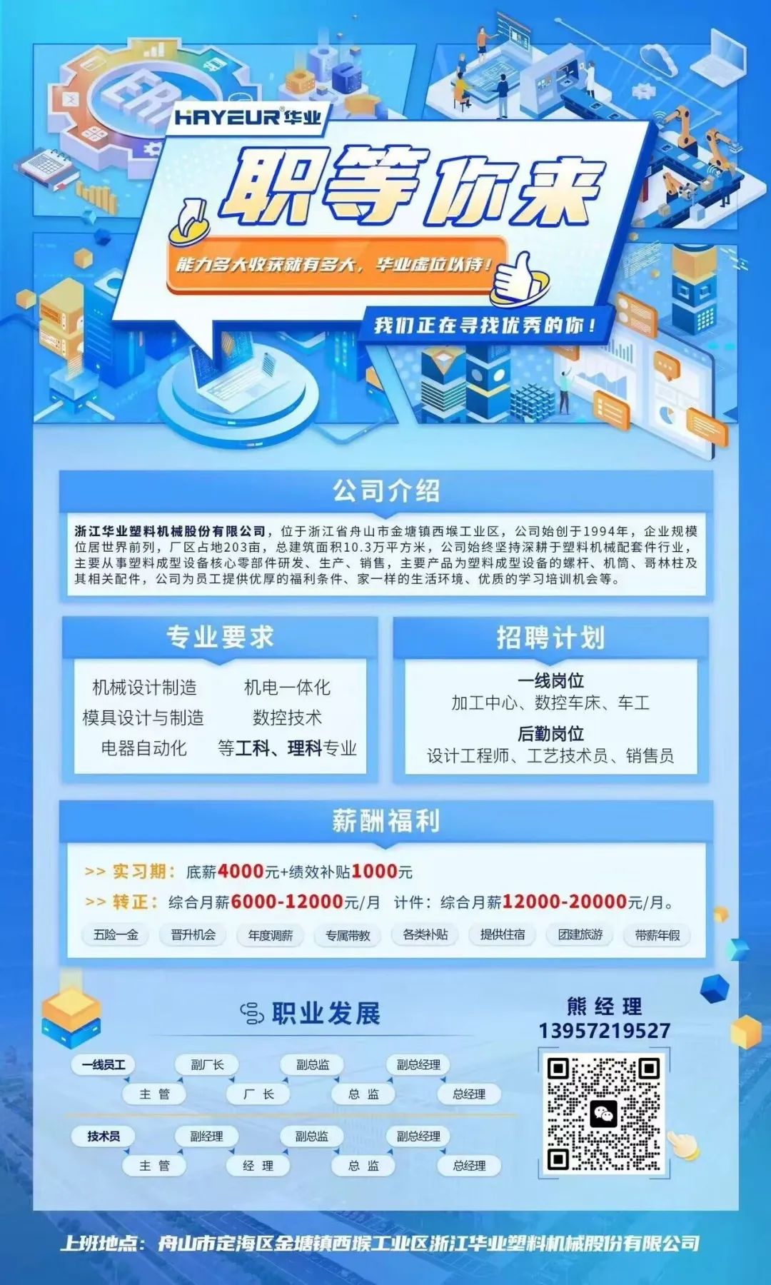 为拓宽毕业生就业渠道,为用人单位和毕业生搭建双向选择平台。浙江华业塑料机械股份有限公司面向我院机械设计制造、数控技术、模具设计与制造专业学生提供岗位需求。