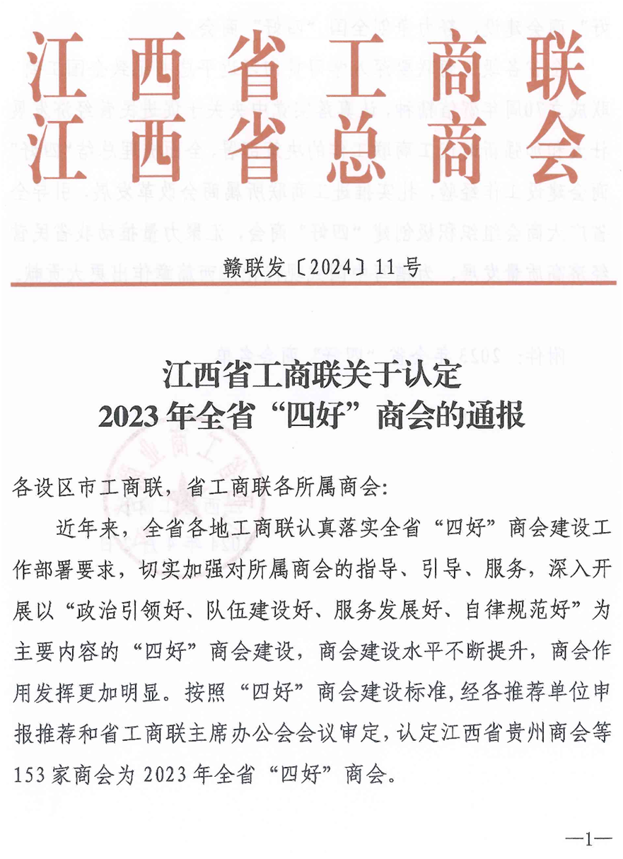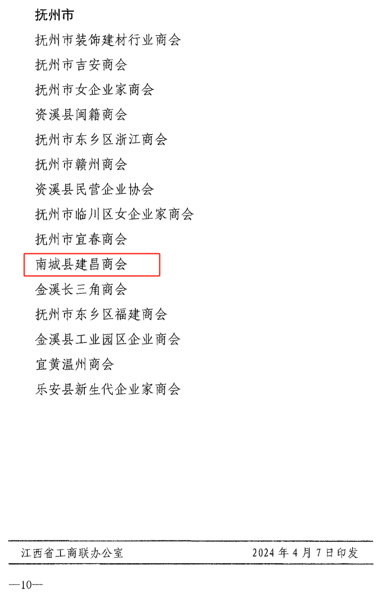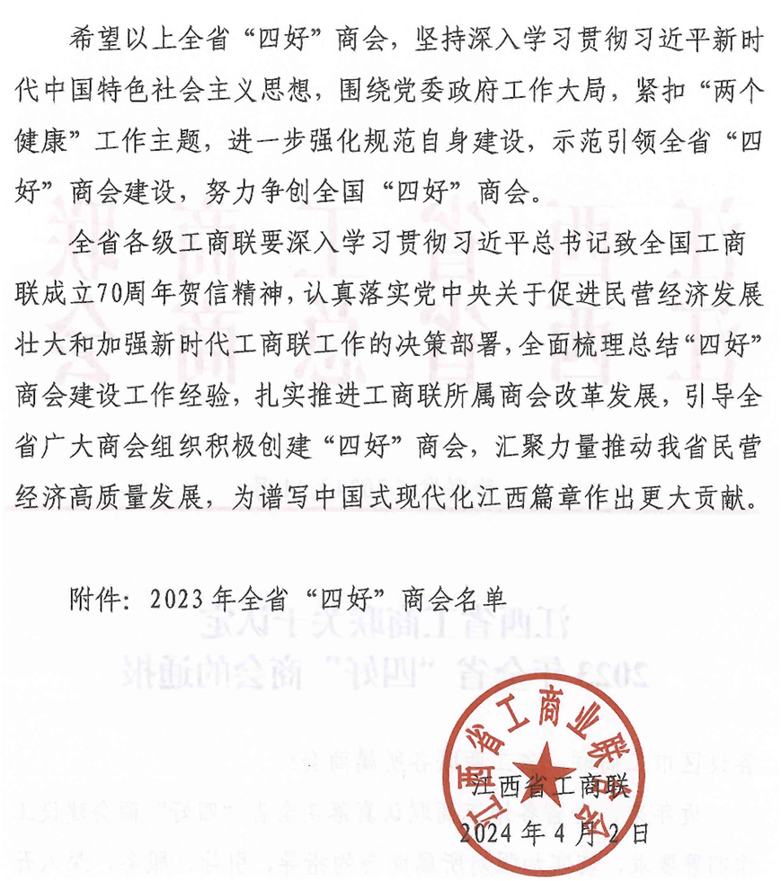 4月7日,江西省工商联、江西省总商会下发了《江西省工商联关于认定2023年全省“四好”商会的通报》,确认全省153家商会为2023年全省“四好”商会,南城县建昌商会被认定为全省“四好”商会。