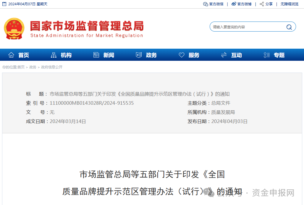 为贯彻落实《质量强国建设纲要》部署,更好发挥质量在促进企业做大做强、支撑产业建圈强链和推动城市可持续发展中的作用,市场监管总局、农业农村部、商务部、文化和旅游部、国家知识产权局联合制定了《全国质量品牌提升示范区管理办法(试行)》,现印发给你们,请遵照执行。