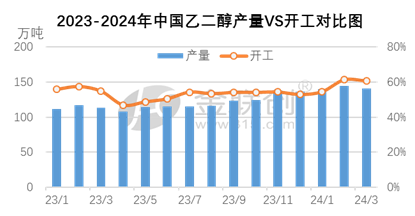 2024年一季度产量在426.46万吨,环比增长7.21%,较去年同期增长24.73%。一季度市场部分时段在供应面利好提振下表现尚可,聚酯产销持续一般,需求面变化有限,且春节前部分聚酯工厂春检,一定程度上影响部分需求,不过受外盘装置集中检修影响,1-2月进口量持续收缩,乙二醇库存亦有所减少,支撑该时段乙二醇价格走势,部分企业利润转好下重启,加之部分常规检修装置恢复,一季度乙二醇整体开工在58.7%附近,环比上涨9.29%,进而导致产量增加。