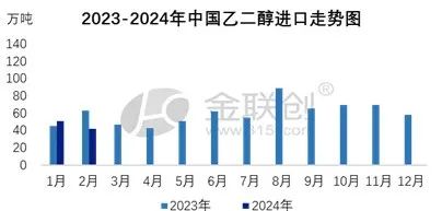 2024年一季度乙二醇进口量呈现缩量,1-2月乙二醇进口量同比下跌13.95%。进口下滑的主要原因在于去年四季度部分沙特装置集中停车,加之1月寒潮影响下美国部分装置短停,外盘供应明显缩减,进而导致1-2月整体进口到港量逐步下滑。