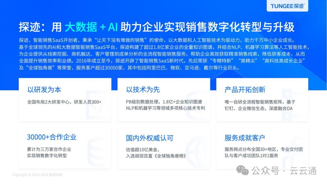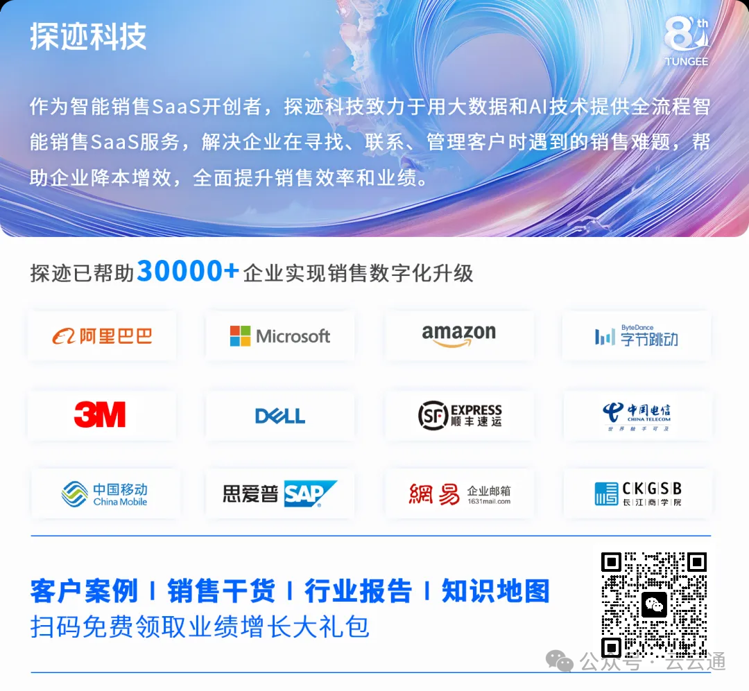 探迹科技,成立于2016年4月,智能销售SaaS开创者,致力于帮助B2B企业在全球上亿家公司中获取精准客户资源,打造全流程智能销售管理闭环,迅速提升销售转化率及销售业绩。
