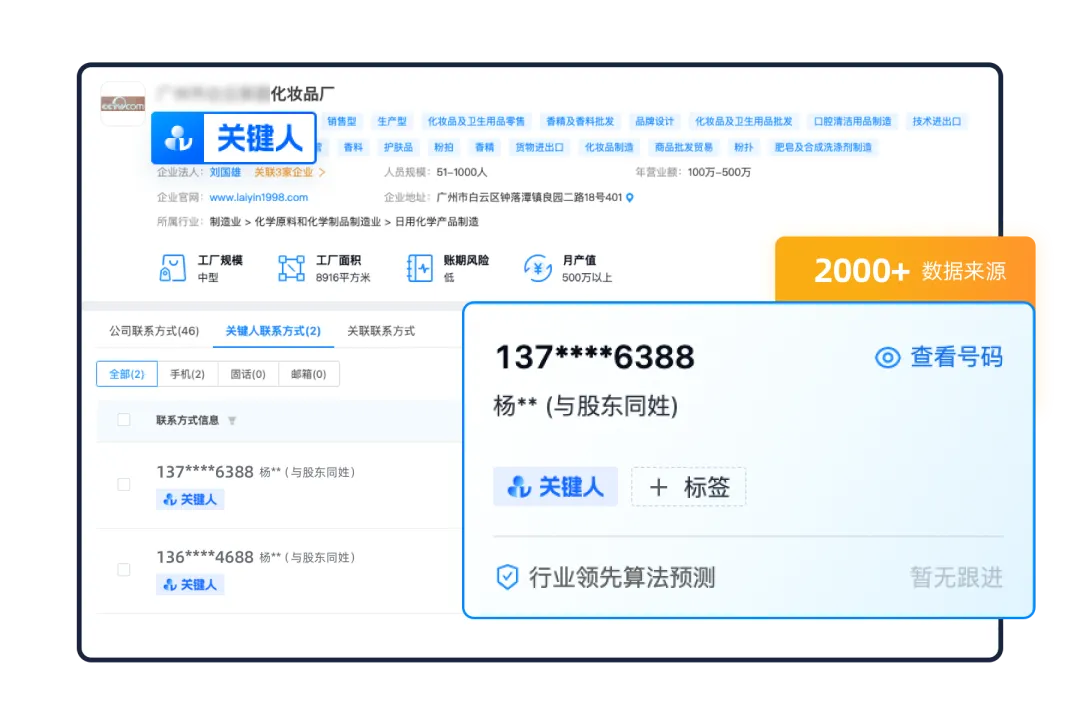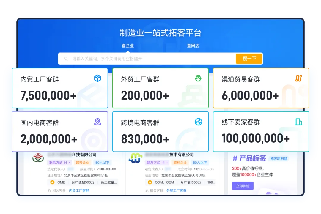 快速获取海量优质客户,1.8亿+市场主体的全量知识图谱,覆盖各行各业客户类型,提供企业查询、高级筛选、地图拓客和智能推荐等丰富的拓客方式,赋能销售快速找到精准客户。不仅仅是更专业的企业查询工具,还能找网店,找展会、找项目。