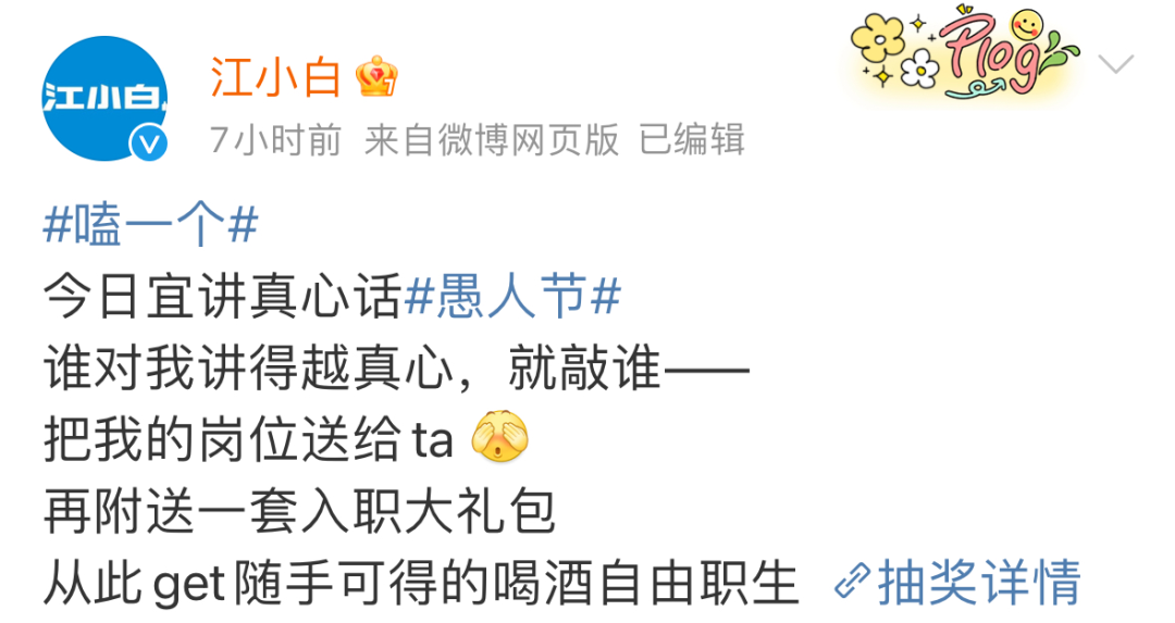 都知道愚人节无真话,而江小白玩了一把反向操作,表示:今日宜讲真心话。这。。。能信?同时,阐述到谁对我讲得越真心,就敲谁——把我的岗位送给ta,再附送一套入职大礼包,从此get随手可得的黑久自由职生。