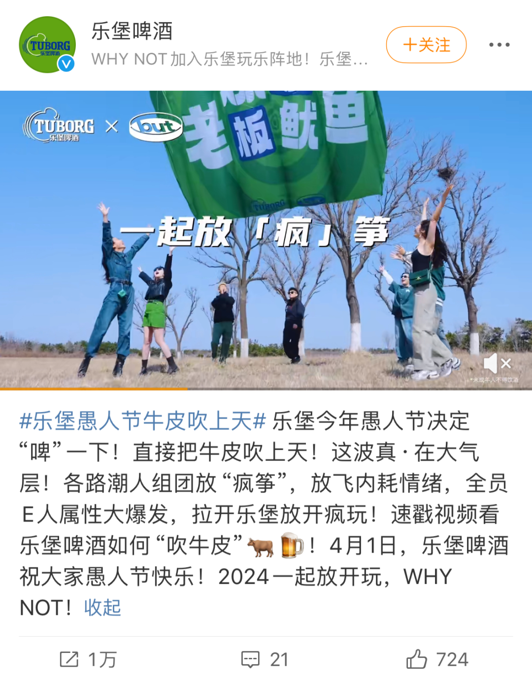 品牌的愚人节,看似愚人,实则夹带着“私货”,即乘机做广告,乐堡啤酒也不能免俗,但是它又有一些令人意想不到的新奇感。用“放疯筝”的谐音梗,将打工人内耗的情绪全部放飞,在疯玩之余,帮助目标受众解压。