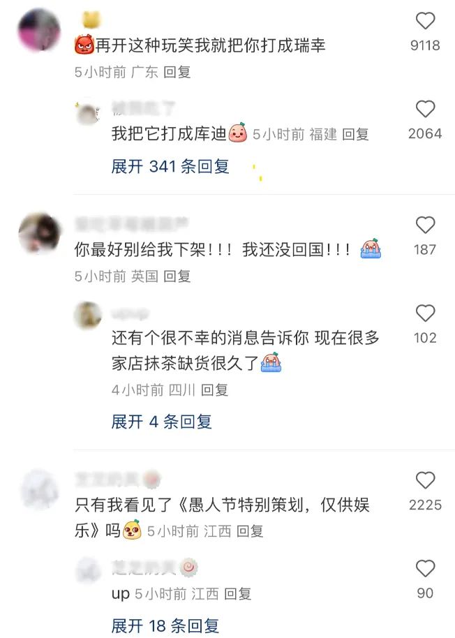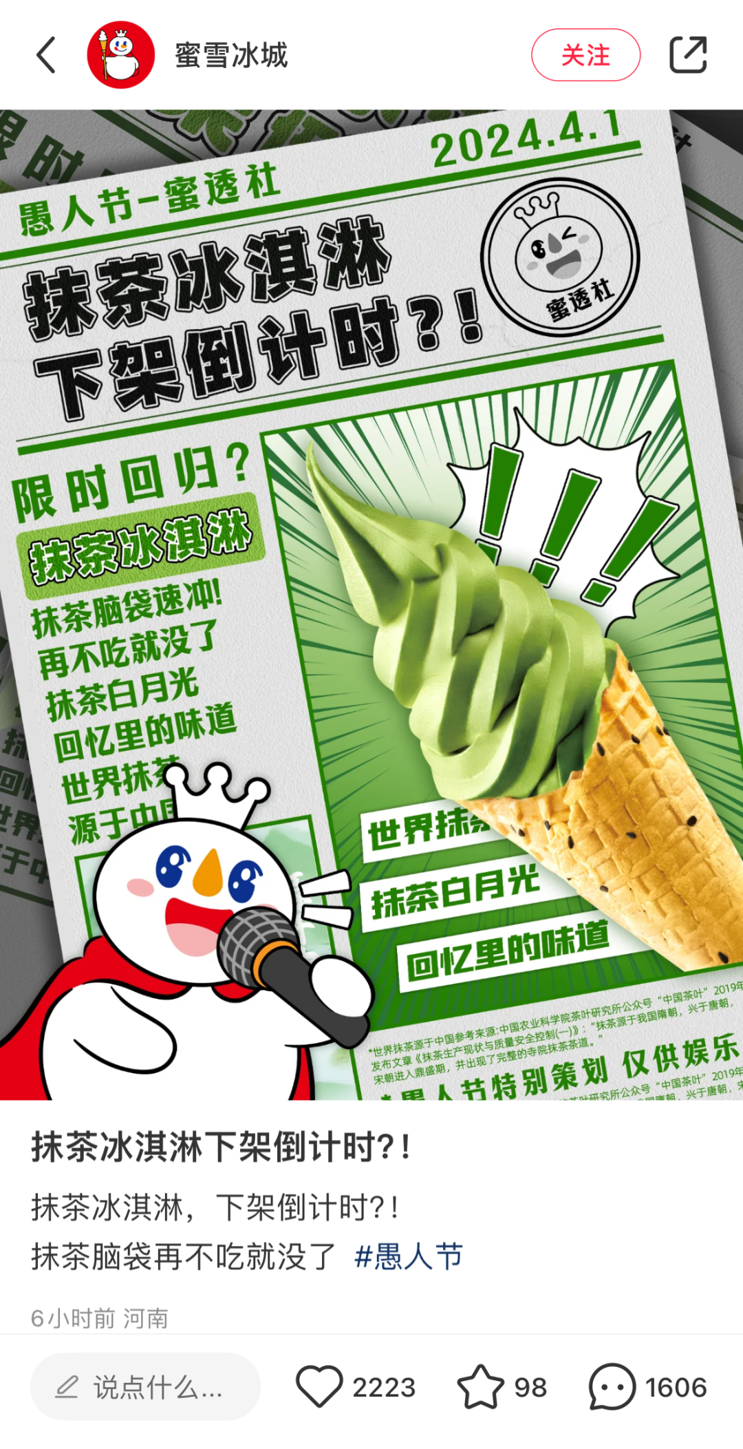 在更多人看来,愚人节就是一次光明正大“说谎”的日子,今天蜜雪冰城的愚人节-蜜透社,就发布了“抹茶冰淇淋下架倒计时?!”的主题海报,让不少抹茶冰淇淋爱好者纷纷围观。细看才知道,其实是产品的限时回归,主打一个饥饿营销。而蜜雪冰城选择今天上线这个营销内容,也是想要通过反向操作拿捏用户。没想到,蜜雪冰城迎来了用户的反向拿捏。有人“威胁”起了品牌,表示再开这种玩笑我把他打成瑞幸。让人突然有了画面感……还有人表示,你最好别给我下架,我还没回国。在一片被“威胁”被“拿捏”中,让蜜雪冰城凭借一张海报,收获了不少流量与讨论,也让品牌在反向营销中,达到了营销的传播诉求,热闹至极。喜茶