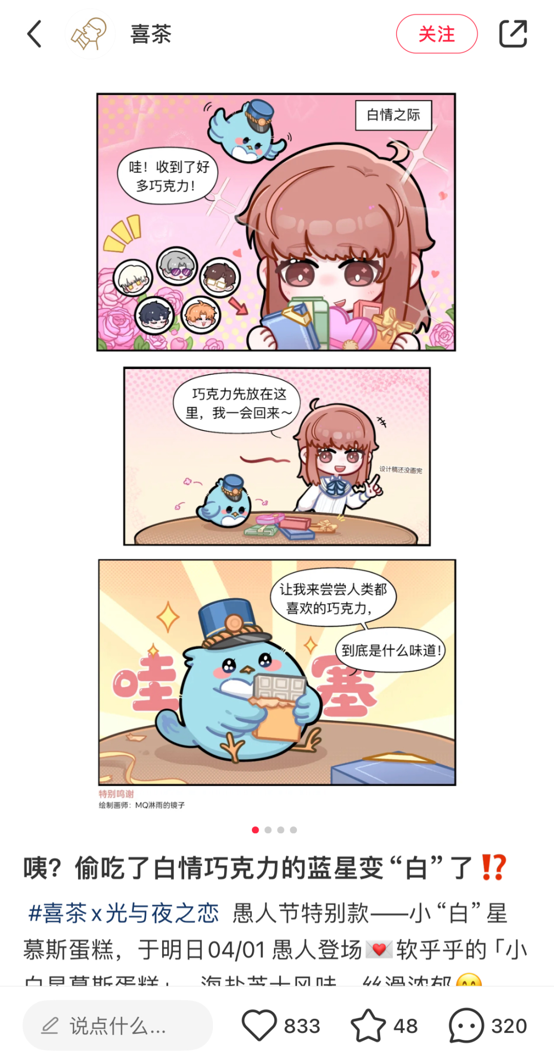 而喜茶在愚人节前夕官宣将上线与光与夜之恋的联名产品——小白星慕斯蛋糕。因为官宣上线的时间是愚人节,让人觉得这事不简单。