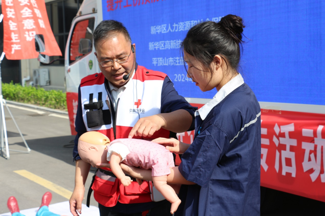 在活动过程中,新华区人社局请来了掌握专业急救知识的医生,通过面对面的方式讲解心肺复苏方法、AED使用方法、海姆立克急救法等各种医学知识和具体操作手法,并让企业职工进行现场实操,确保在场人员能将这些救命的安全知识掌握到位。