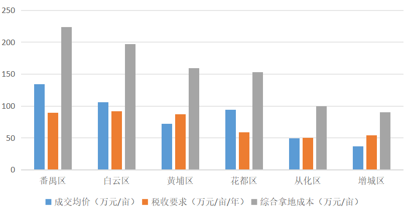 结果显示产业在番禺区和白云区拿地的综合成本较高,特别是番禺区超过了200万元每亩。