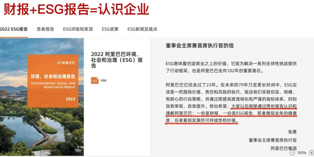 按照阿里巴巴前董事会主席张勇的话说:大家以后认识和了解阿里巴巴,只需要两份报告:一份是财报,一份是ESG报告!
