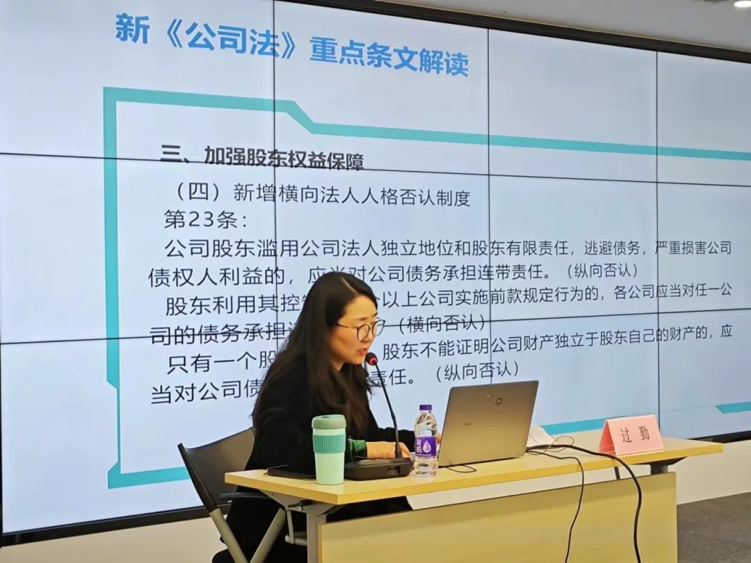 培训会上,江苏悦通尚诚律师事务所的党支部书记、律所合伙人过勤女士作为主讲嘉宾,为大家带来了精彩纷呈的解读。过勤律师以其深厚的法律功底和丰富的实践经验,深入剖析了新《公司法》的重点条文,并结合实际案例,为大家提供了切实可行的合规建议。过勤律师指出,新《公司法》的修订旨在进一步完善公司制度,加强企业内部治理,保护股东权益,促进企业健康发展。企业应当以此为契机,加强内部管理,提升法律意识,确保企业合规经营。同时,就企业如何应对新法带来的挑战和机遇进行了深入探讨。强调,企业应当加强对新公司法的学习和理解,及时调整经营策略,优化治理结构,确保企业在新公司法实施后能够顺利过渡并取得更大发展。