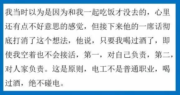 因为人缘不错,技术也不错,所以外快的收入也比较好,大家经常和他开玩笑,说他来钱容易,他也没作辩解,直到一次和他吃饭时,发生一件事才知道,电工干私活还真的不是我们想的那么那么简单。