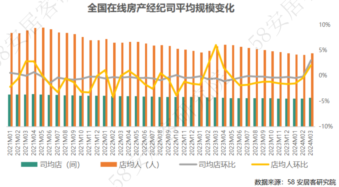 2024年1-2月份,受春节假期返乡影响,在线房产经纪行业规模下行,经纪司、经纪门店和经纪人数量环比呈减少趋势。3月份,受节后正常的复工影响,在线作业的经纪门店和经纪人数量开始上涨。