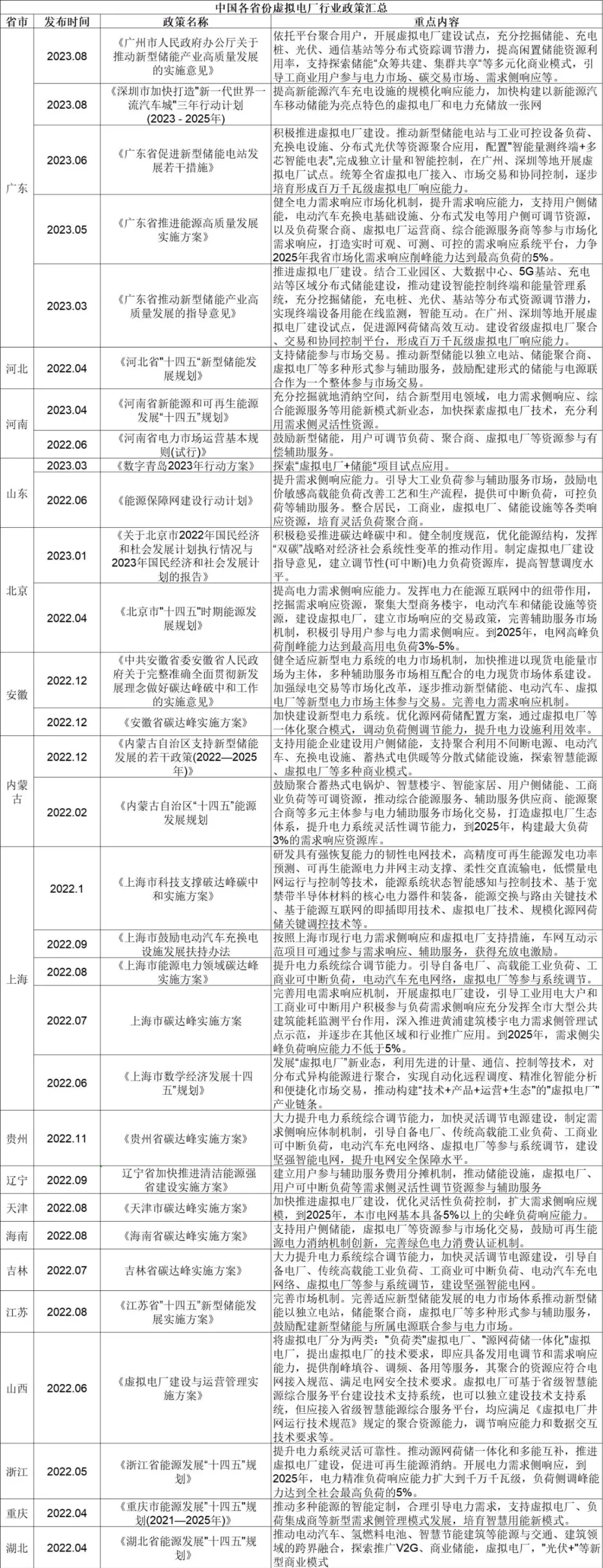 随着国家大力支持虚拟电厂建设的方向逐渐明朗,省市级层面的虚拟电厂政策也陆续发布。其中,广东和上海在新型储能、电动汽车充换电以及碳达峰等政策中多次明确提到“积极推进虚拟电厂建设”,多省市的《碳达峰实施方案》以及《能源发展“十四五”规划》也从新型电力系统建设、需求侧响应等方面支持虚拟电厂发展,山西则发布《虚拟电厂建设与运营管理实施方案》专项政策,将虚拟电厂分为“负荷类”虚拟电厂和“源网荷储一体化”虚拟电厂两大类,分别从运营管理和并网运行两方面对省内虚拟电厂进行规范。