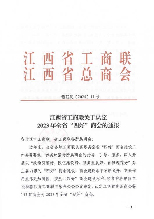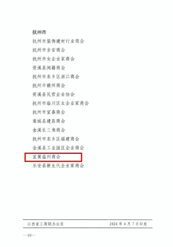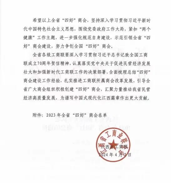 4月7日,江西省工商联、江西省总商会印发《江西省工商联关于认定2023年全省“四好”商会的通报》(赣联发〔2024〕11号),对2023年度“政治引领好、队伍建设好、服务发展好、自律规范好”等方面工作成绩突出的商会予以“四好”商会认定,宜黄温州商会喜获2023年全省“四好”商会荣誉称号。