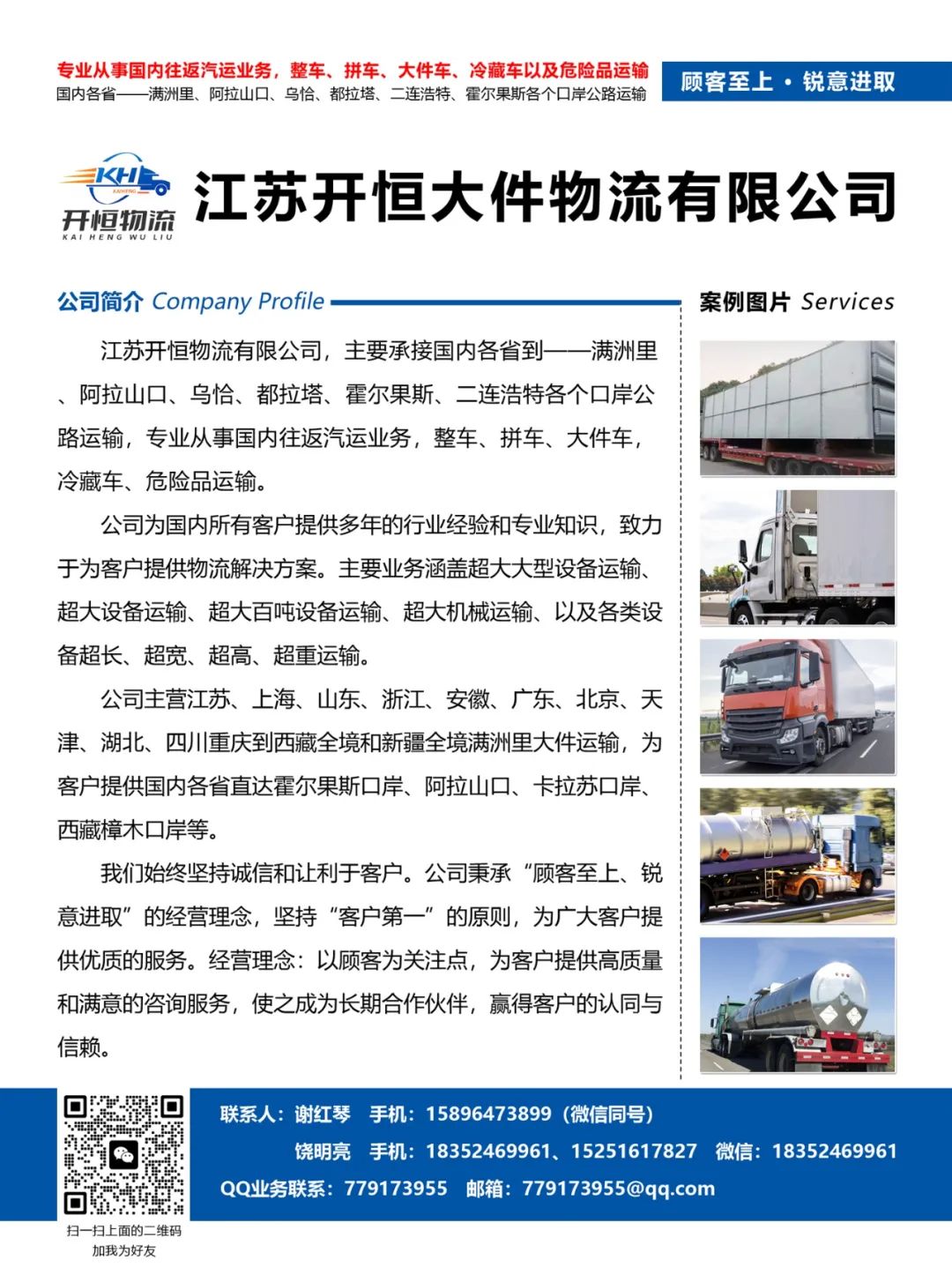 江苏开恒物流有限公司,主要承接国内各省到——满洲里、阿拉山口、乌恰、都拉塔、霍尔果斯、二连浩特各个口岸公路运输,专业从事国内往返汽运业务,整车、拼车、大件车,冷藏车、危险品运输。