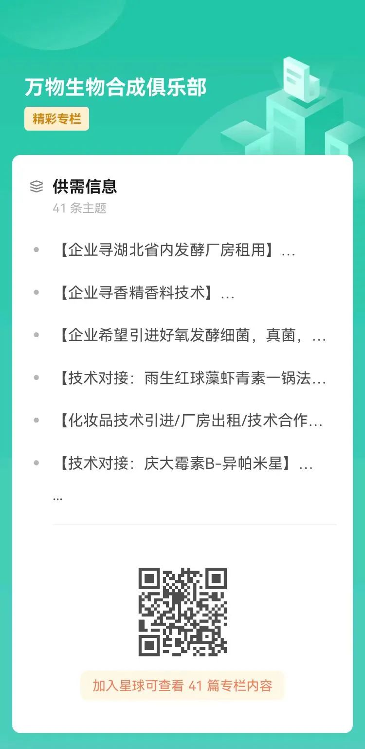 万物生物合成俱乐部知识星球已聚集众多行业专家和相关企业,更多前沿合成生物学资讯请见星球,有需求的也可以在星球中直接发布