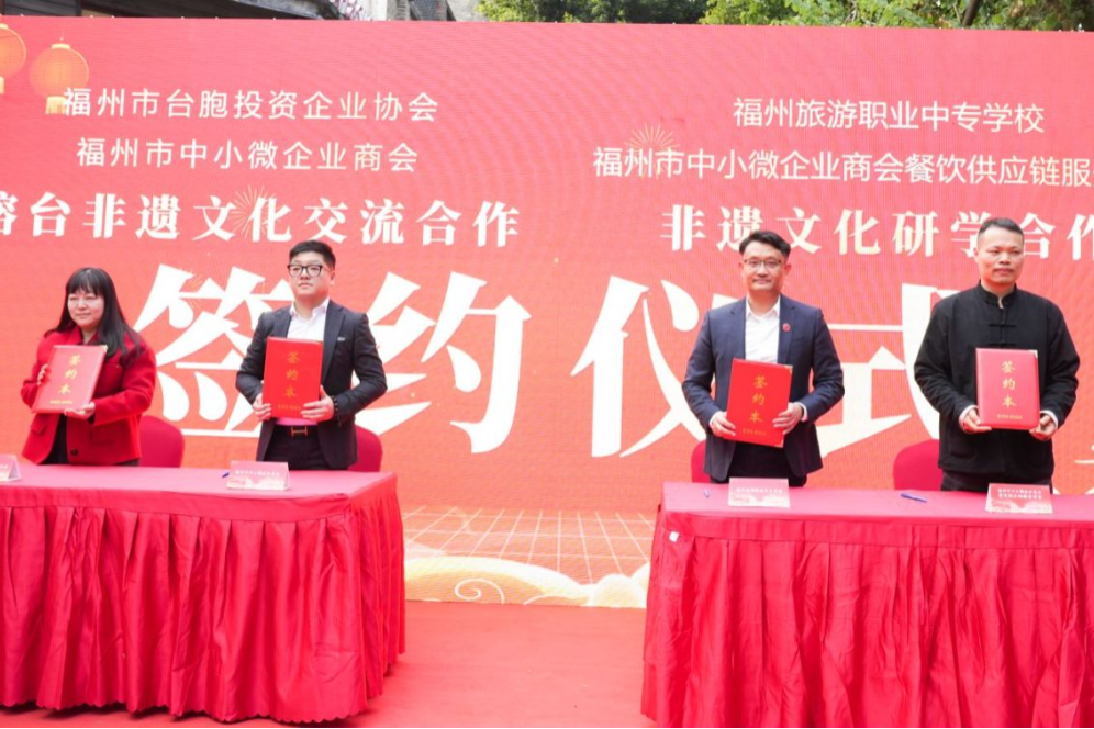 现场,福州市中小微企业商会餐饮供应链分会正式揭牌成立,分会将通过优化供应链流程,降本增效,实现合作共赢。福州市中小微企业商会与福州市台企协会、福州旅游职业中专学校就未来的合作达成了共识,分别签署“榕台非遗文化交流合作协议”、“非遗文化研学合作协议”,共同推动榕台两地非遗文化的保护和传承。
