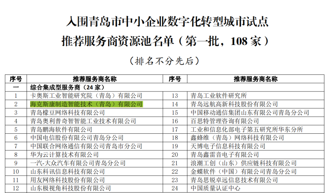 数字化技术引领的新一轮科技革命和产业变革,正在为中国经济与社会发展提供强劲动力。近日,青岛市民营经济发展局公布了青岛市中小企业数字化转型城市试点推荐服务商资源池入围名单(第一批),海克斯康制造智能技术(青岛)有限公司成功获批“综合集成型服务商”。