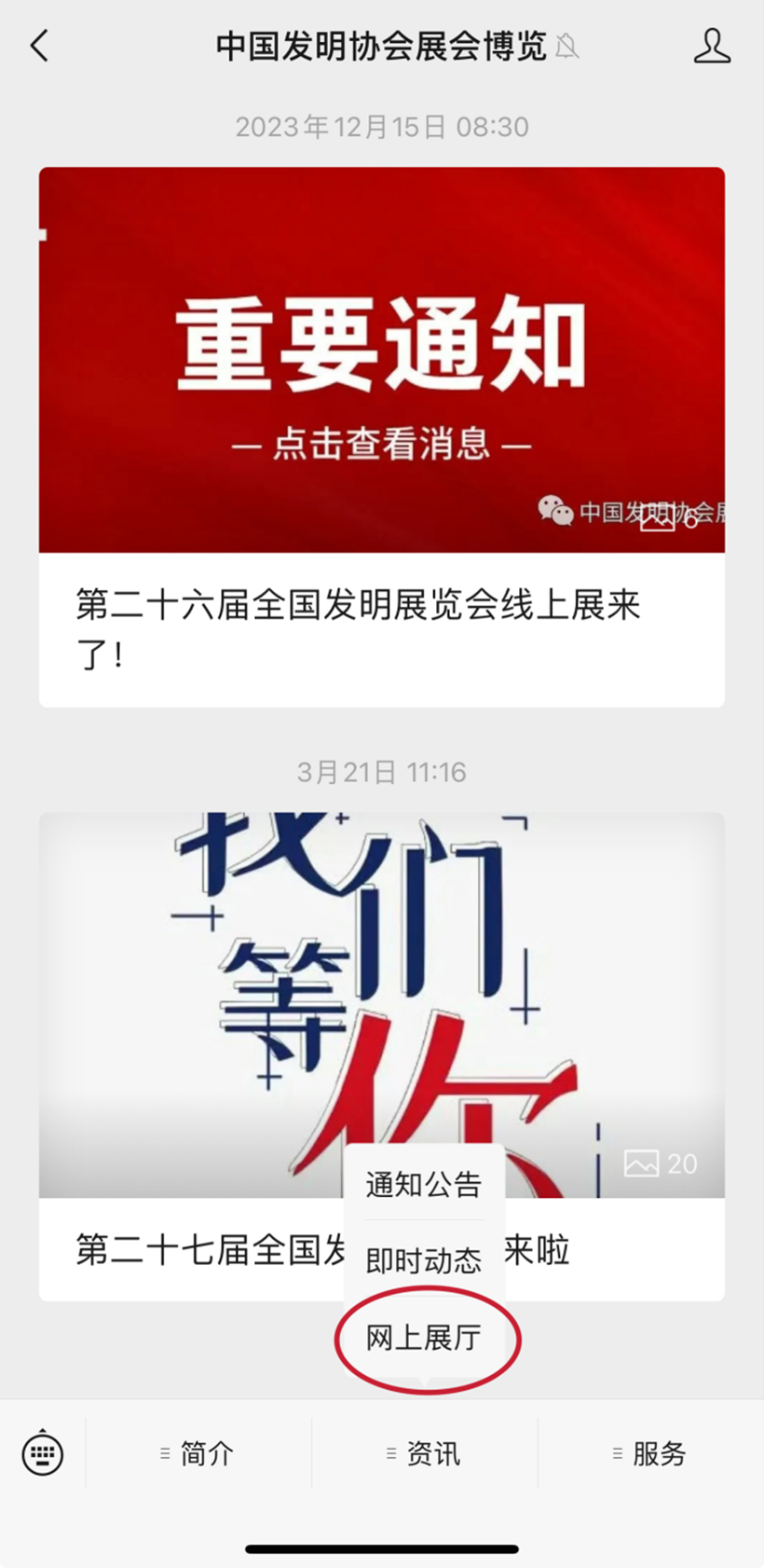 关注微信公众号“中国发明协会展会博览”,点击底部菜单“资讯”栏中的网上展厅即可进入。