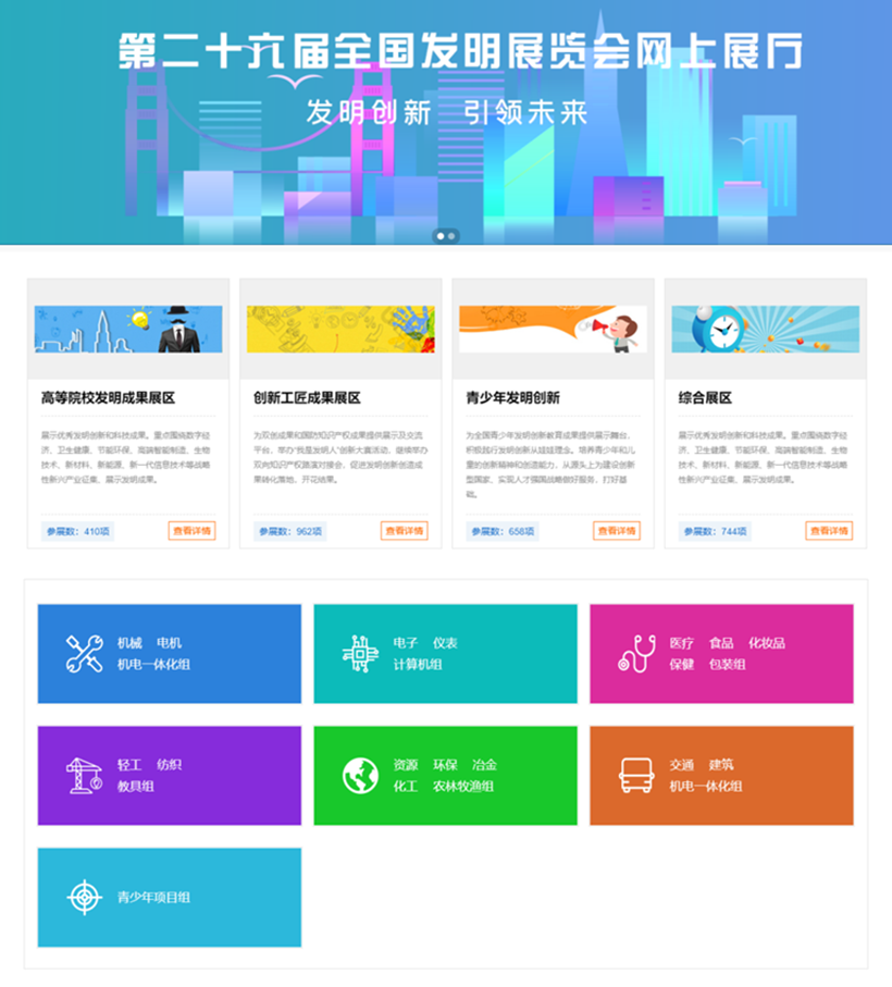 网上展厅设置四大展区,分别为“高等院校发明成果展区”、“创新工匠成果展区”、“青少年发明创新展区”以及“综合展区”,共计展示发明创新项目2774项。
