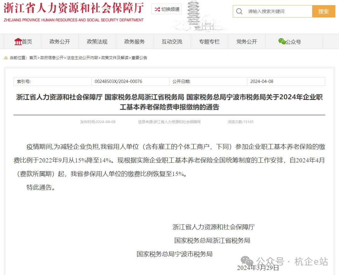近日,浙江省人力资源和社会保障厅、国家税务总局浙江省税务局、国家税务总局宁波市税务局发布关于2024年企业职工基本养老保险费申报缴纳的通告。