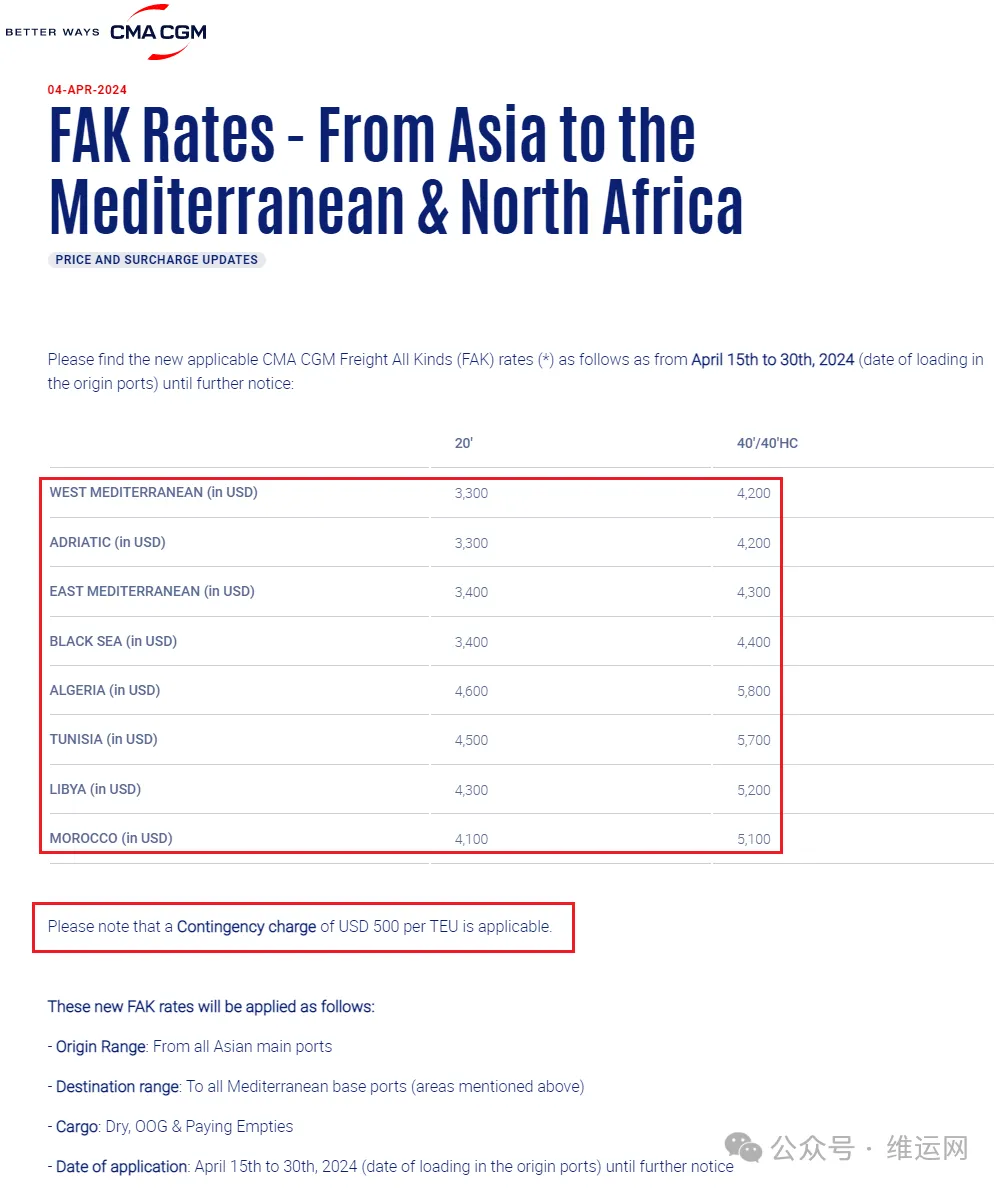 CMA更新从亚洲到地中海和北非FAK费率。2024年4月15日至30日(始发港装货日期),直至另行通知。还需注意的是,适用收取500美元每TEU的应急费用。具体收费标准如下: