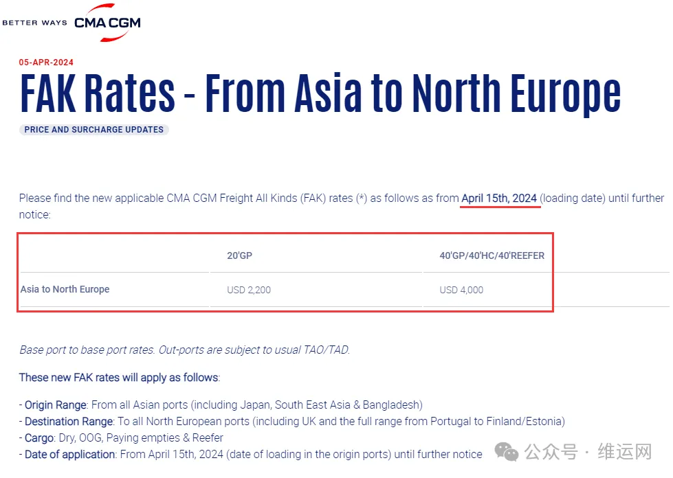 CMA更新从亚洲到北欧FAK费率。自 2024 年 4 月 15 日(装货日期)起,直至另行通知。每20英尺干箱2200美元,每40英尺干箱/高箱/冷藏箱4000美元。详情如下:
