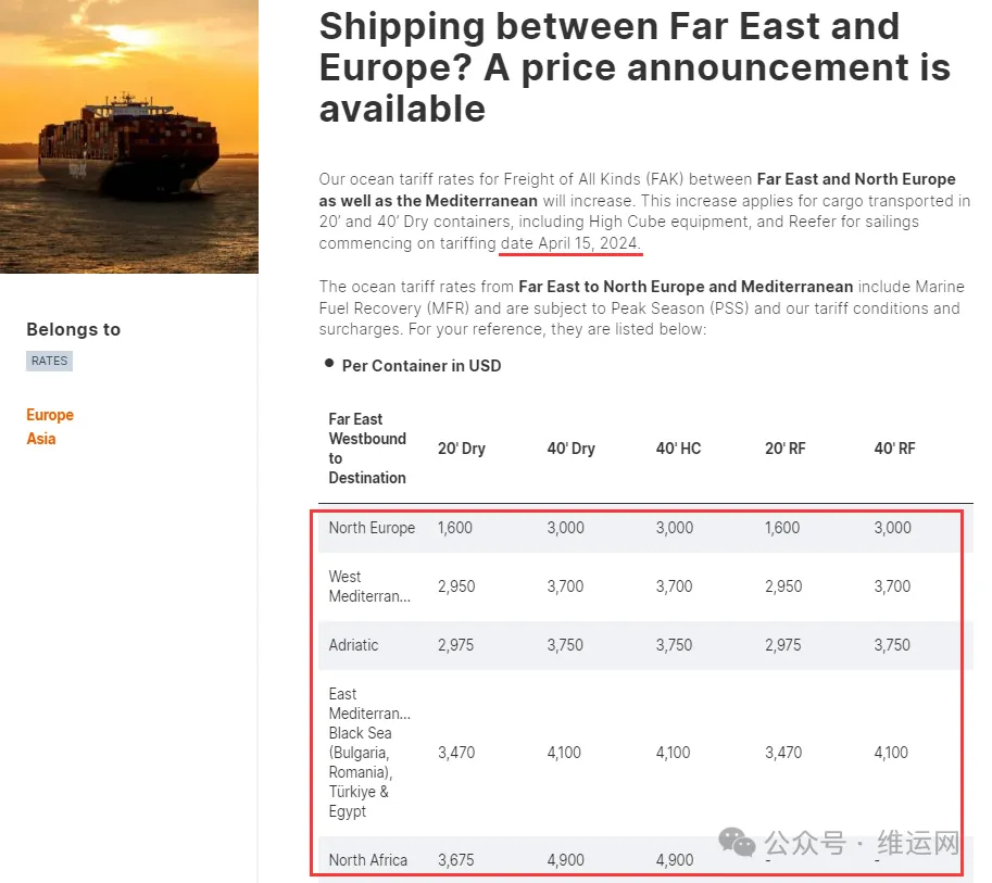 赫伯罗特发布公告称,2024年4月15日,在远东和北欧以及地中海之间往返的FAK费率将上调,提价适用于20英尺和40英尺集装箱(包括高柜和冷藏箱)运输的货物。具体收费标准如下: