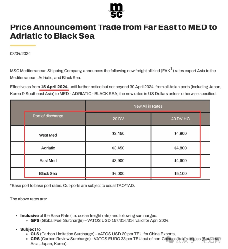 MSC地中海航运发布公告,自2024年4月15日起,直至另行通知,但不迟于4月30日,所有亚洲港口(包括日本、韩国和东南亚)至地中海、亚得里亚海和黑海征收新FAK费率。详情如下: