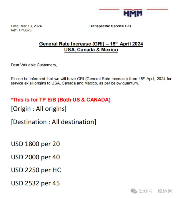 2024年4月15日起,HMM将对从所有始发地到美国、加拿大和墨西哥的服务实行新 GRI。根据HMM最新发布的公告,5月1日起的征收标准相同。详情如下: