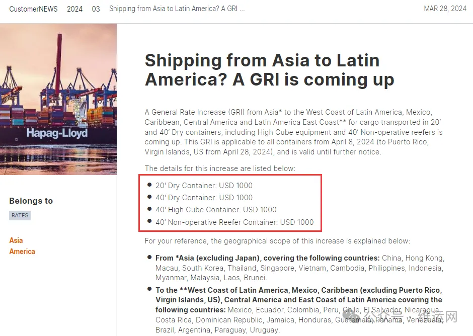 赫伯罗特发布新公告,从亚洲到拉丁美洲、墨西哥、加勒比海和中美洲的货装箱征收GRI,适用于20英尺和40英尺干货集装箱货物(包括高箱和40英尺非运行冷藏箱),标准为1000美元,自2024年4月8日起适用于所有集装箱,有效期至另行通知。详情如下: